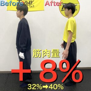 ご入会頂き10ヶ月が経過した身長167cm、15歳のお客様です。TODAYでの週1回のTODAYパーソナルトレーニングで、10ヶ月で体重は驚きのプラス11kg、体脂肪率はマイナス7%、そして筋肉量はプラス8%と腹筋も足周りの筋肉も大幅にアップしています!