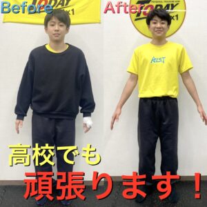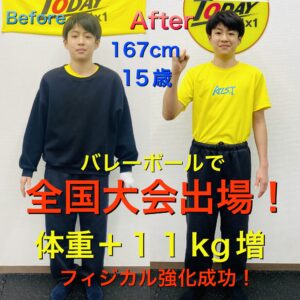 中学2年生の10ヶ月前、バレーボール競技で全国大会に行きたい!とご入会頂きました。体幹強化を中心に全身を鍛え、3年生の夏、和歌山県で行われた念願の全国大会に行くことが出来ました。