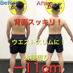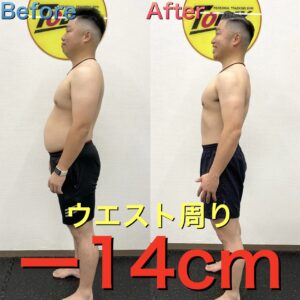 TODAYでの週1回のパーソナルトレーニング、ご自身でランニングをされて、体重は2ヶ月で驚きのマイナス14kg、体脂肪率はマイナス6%、ウエスト周りはマイナス14cm、太腿周りはマイナス11cmになっています!体内年齢もマイナス8歳も若返り、内臓脂肪の数値は大幅ダウン、筋肉量も基礎代謝も大幅にUPしています!