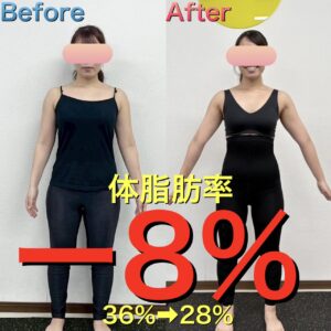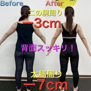 TODAYでの週1回のパーソナルトレーニング、TODAY食事メニューで管理、体重は3ヶ月でマイナス7kg、体脂肪率はマイナス8%、ウエスト周りは驚きのマイナス10cm!太もも周りはマイナス7cm、二の腕周りはマイナス3cmとなっています。体内年齢も9歳も若返り、内臓脂肪の数値は大幅ダウン、筋肉量も基礎代謝も大幅にUPしています!