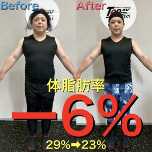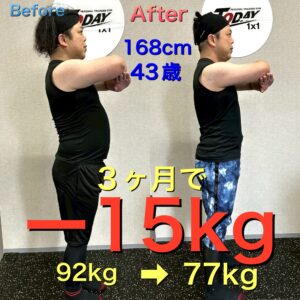 TODAYでの週1回のパーソナルトレーニング、TODAY食事メニューで3ヶ月管理、体重は3ヶ月で驚きのマイナス15kg!
