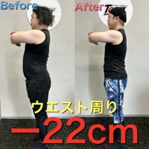 体脂肪率はマイナス6%、ウエスト周りはなんとマイナス22cmとなっています。体内年齢も10歳も若返り、内臓脂肪の数値は大幅ダウン、筋肉量も基礎代謝も大幅にUPしています!