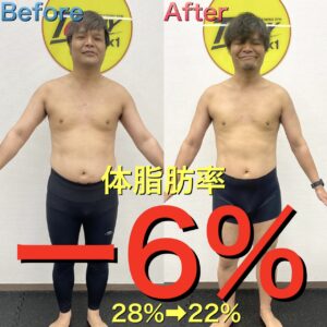 TODAYでの週1回のパーソナルトレーニングで体重は3ヶ月で驚きのマイナス10kg、体脂肪率はマイナス6%、ウエスト周りはマイナス15cmとなっています!体内年齢も8歳も若返り、内臓脂肪の数値は大幅ダウン、筋肉量も基礎代謝も大幅にUPしています!