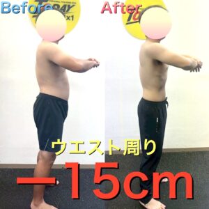 TODAYでの週1回のパーソナルトレーニング、TODAY食事メニューで管理させて頂き、報告して頂いた結果、体重は驚きのマイナス14kg、体脂肪率はマイナス8%、ウエスト周りはマイナス15cm 、体内年齢は10歳も若返り、内臓脂肪の数値は大幅ダウン、筋肉量も基礎代謝も大幅にUPしています!